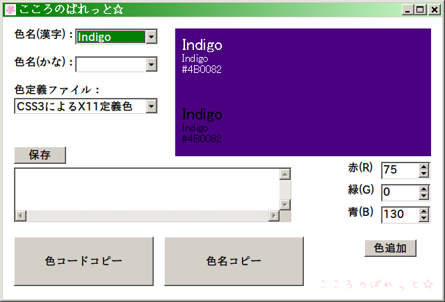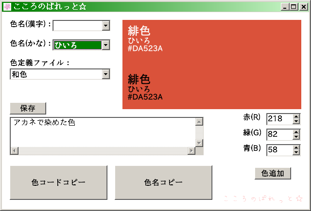 ホームページを作る際に色を選ぶとき、私は和色一覧が載った Web サイトを利用していましたが、いろいろな色を試すときにいちいちコピペするのが面倒だったのでローカルで動くソフトを作りました。